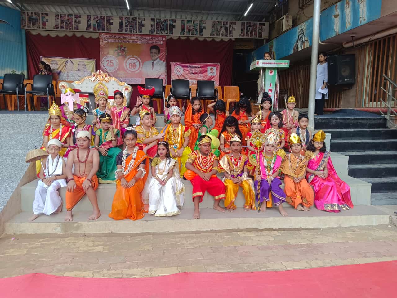 Students from Pre-Primary to Std 2 dressed as Rishis and Goddesses. The event began with lighting the lamp and garlanding Goddess Saraswati’s photo.