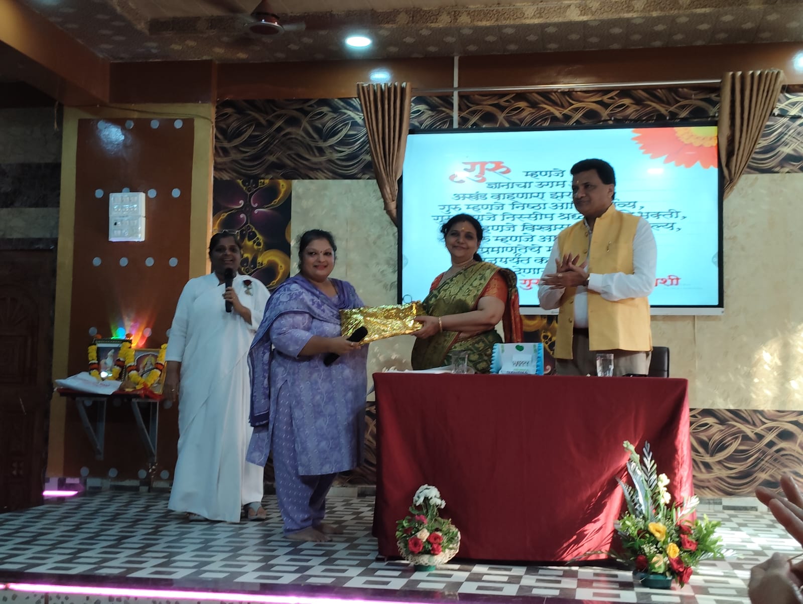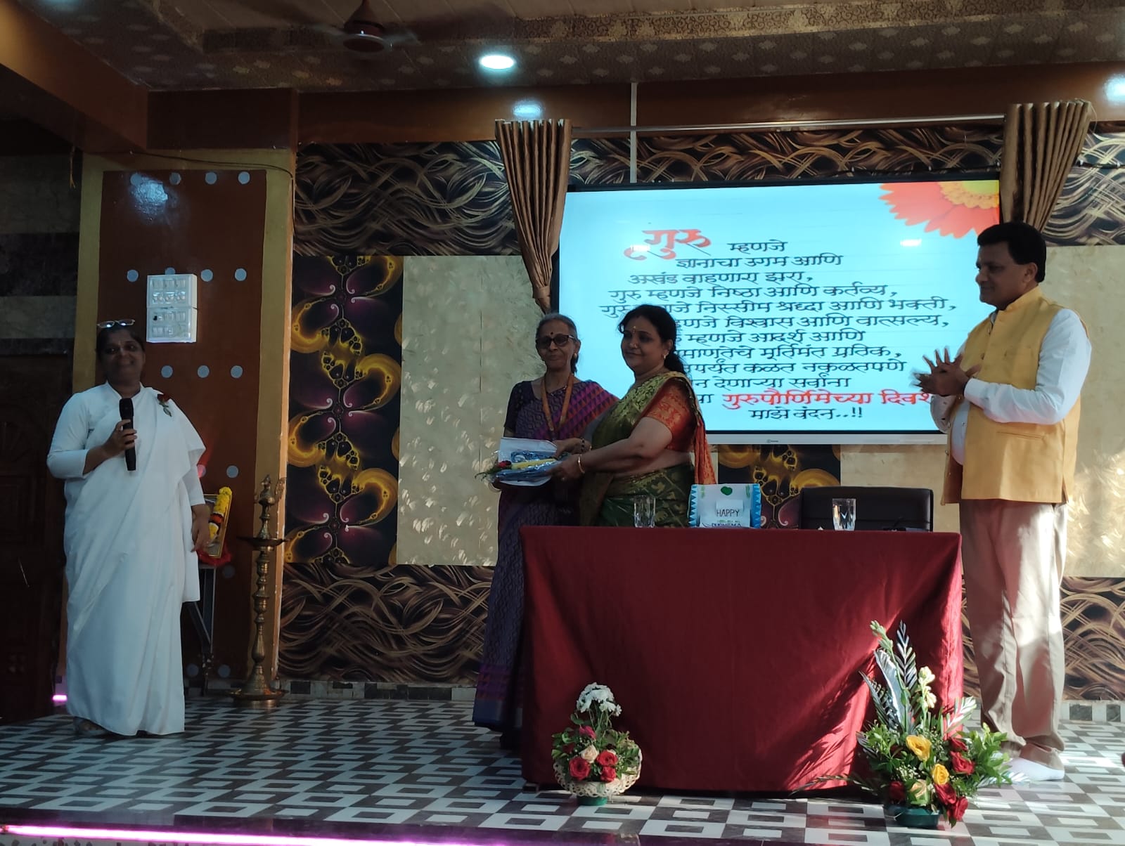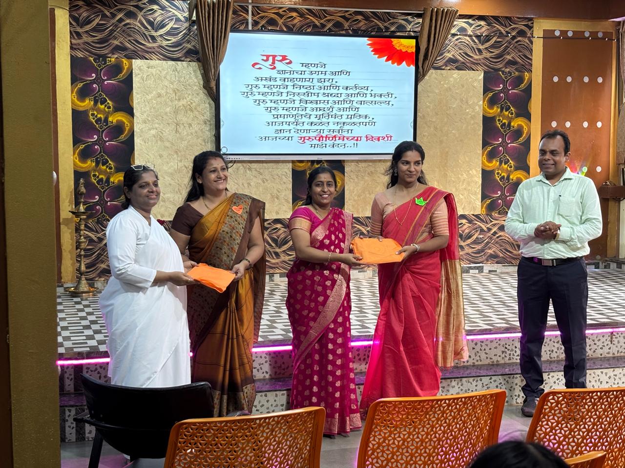The program began with lamp lighting and Saraswati Puja, followed by the felicitation of Principal Dr. Tejavathi Kotian. Guests addressed the gathering, highlighting the importance of Gurupurnima and the role of teachers.